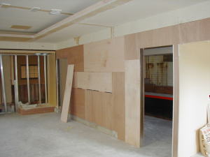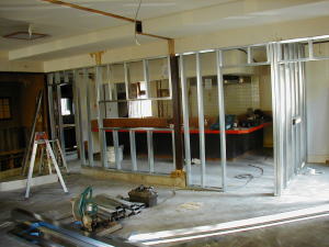 3.軽量鉄骨工事 カウンター側とホール側に分ける為に壁をつくります。 |