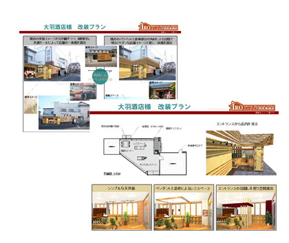 | 打合せ内容 | 外装プランの前提条件として、正面のエントランスを駐車スペース側に変更し、 既存の躯体を活かしたまま、ワインショップとしてイメージアップを図ることがありました。内装の仕上がりイメージも何パターンかご提案。 |