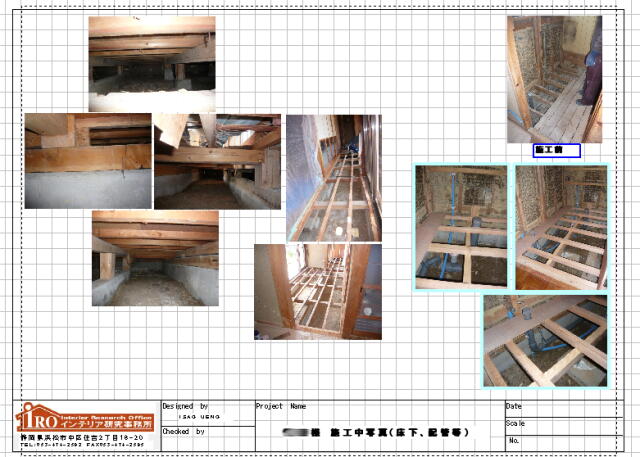 | 【施工中】 施工中の写真もきちんとファイルしておきます。 下地の状態や床下の状態など、仕上がってからでは見ることができない部分も きちんとクライアントに報告します。 |