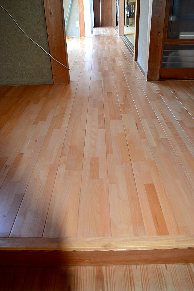 | 【廊下の床】 何種類か実物サンプルを用意して、現況と合わせたこの無垢の床材を選んでいただきました。 やはり”無垢”は存在感がありますね! |