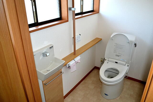 | 【トイレ】 将来的なことも考えて、男子の小便器はとりやめて、洋風便所プラス手洗い付きカウンターで 空間にも余裕のあるWCに仕上げました。 最後まで悩んでおられましたが、正解だったとこれまた最後はお褒めの言葉をいただきました。 ありがとうございます。 |
