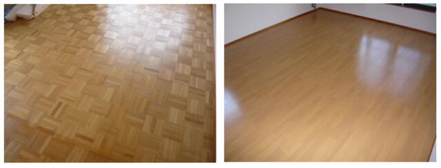 | 【2階洋間の床】 「上野さん。このギシギシなる床なりが気になってしょうがないので張り替えて!」 そんなお電話からスタートです。 床なりは既存の床をめくってみないとわかり難い。。。 は正直のところですが、費用対効果で今回は 上張りすることに決定! かなりのビスを打ちました。 お蔭様で床なりもなくなり、きれいなフローリングの床に仕上がりました。 |