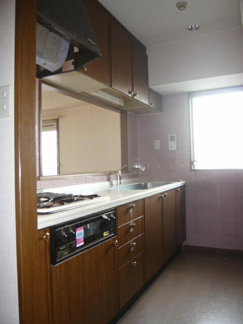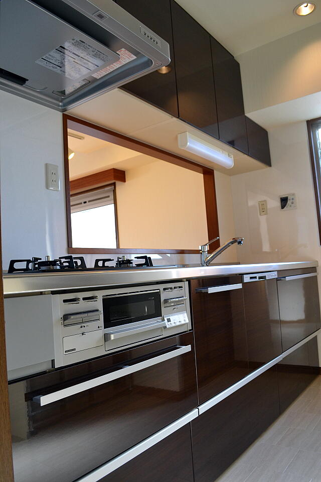 | 【キッチン】 料理好きの奥様がキッチンは絶対に取り替えると決めてらっしゃいました。 全体的にお掃除がラクなものでね!というご要望。 特に換気扇はですね。 IHではなくガスでOK。でも食洗機はつけたい。 食器棚もこの裏面に同じものを用意しました。 |