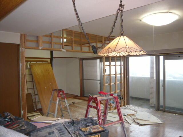 | 【リビング】 解体工事の写真でお解りかと思いますが、すごく苦労しました。 写真ではわかり難いですが、和室との3本引き込みは特注で最大限大きく開口がとれるよう工夫しました。 また、窓の上にもちょっとした工夫で。。。 |