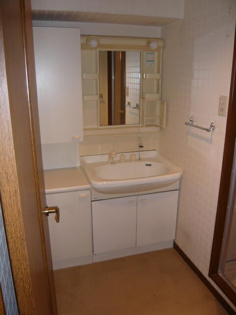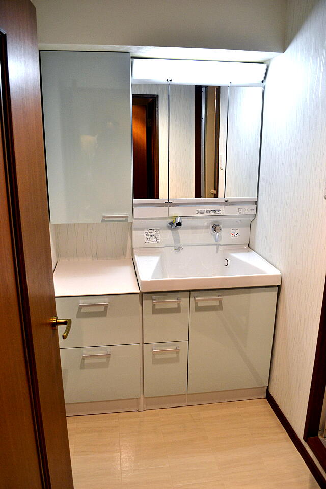 | 【洗面所】 ・洗面もすごく苦労したんです。実は。。。 梁の関係で入る洗面化粧台が。。。 本当にギリギリで、うちのブレーン(職人様)は優秀です。 |
