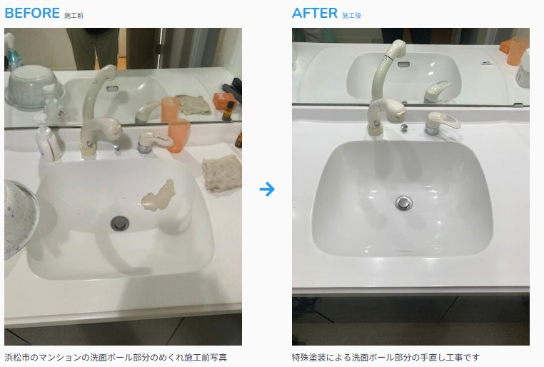 浴槽の塗装技術を応用することで、交換に比べて工期は最短1日~、費用も大幅に削減でき、お客様には大変ご満足いただきました。水回りのトータルリフレッシュをご検討の際は、ぜひ洗面台の特殊塗装もご相談ください。